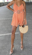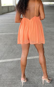 The Brunch romper is a swing short romper. Sleeveless. Back zipper. Sleeveless. Adjustable spaghetti straps. V-necklin. Lining. Brunch ready. Day party ready